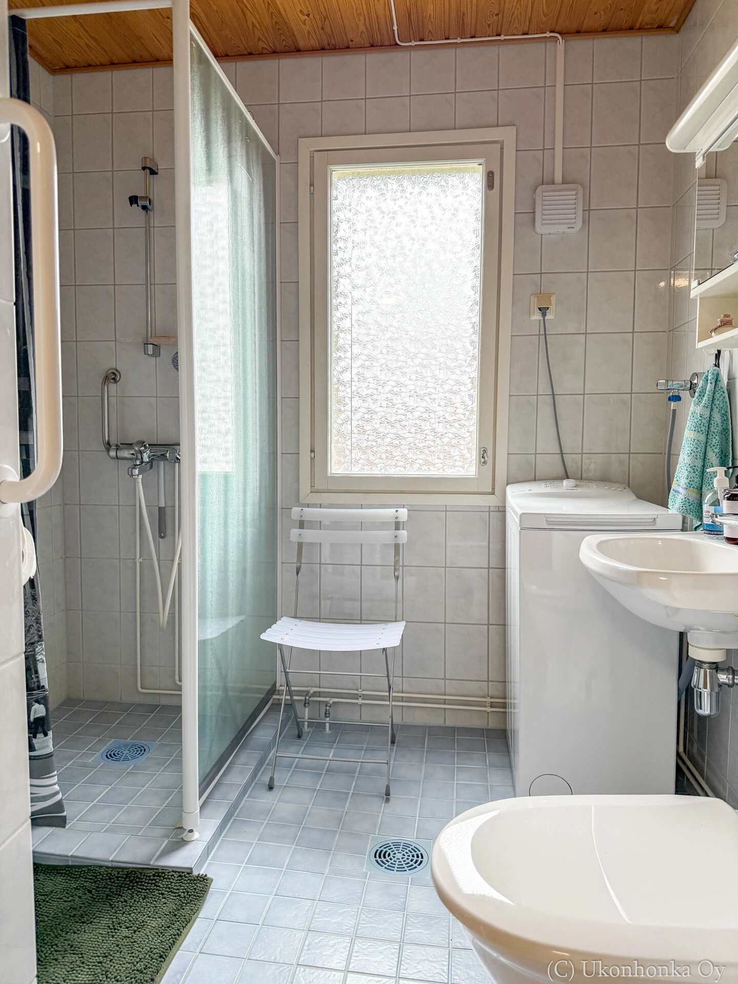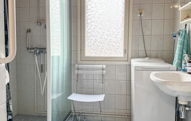 Bathroom with shower, toilet, washing machine, hairdryer, toilet paper, drying rack, shampoo, shower gel, hand soap, laundry detergant, iron and ironing board