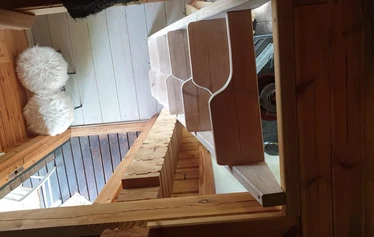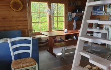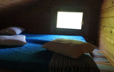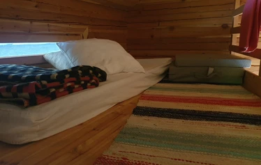 Mökissä on parvella patjat neljälle (katso kuvat). Lisävuodetta (alhaalla) käytettäessä maksimiyöpyjämäärä 5 hlö. Liinavaatteet tilauksesta tarvittaessa 15€ / hlö.