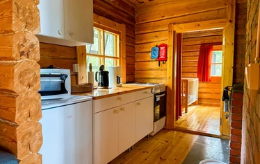 Hyvin varusteltu keittiö: sähkö- ja puuhella, jääkaappi pakastelokerolla, mikroaaltouuni, kahvinkeitin, vedenkeitin, leivänpaahdin, ruuanlaittovälineet, astiasto, perusmausteet, WC- ja talouspaperit
